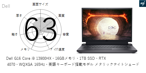 「Dell G16 Core i7 13650HX・16GBメモリ・512GB SSD・RTX 4060・WQXGA 165Hz搭載モデル クォンタムホワイト」はを採用しており、その性能は x となります。CPUスコアはです。