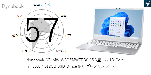 「dynabook CZ/MW W6CZMW7FAS 15.6型フルHD Core i7 1360P 1TB SSD Officeなし プレシャスシルバー」はを採用しており、その性能は x となります。CPUスコアはです。