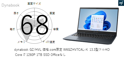 「dynabook GZ/HVL 価格.com限定 W6GZHV7BAL-K 13.3型フルHD Core i7 1260P 1TB SSD Officeあり」はを採用しており、その性能は x となります。CPUスコアはです。