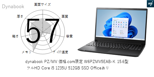 | 商品名 | dynabook PZ/MV 価格.com限定 W6PZMV5DDB-K 15.6型 フルHD Core i5 1235U 256GB SSD Officeあり | |||