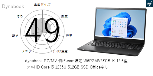 「dynabook PZ/MV 価格.com限定 W6PZMV5FBB-K 15.6型 フルHD Core i5 1235U 256GB SSD Officeなし」はを採用しており、その性能は x となります。CPUスコアはです。