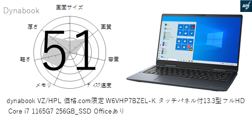 「dynabook VZ/HPL 価格.com限定 W6VHP7CZEL-K タッチパネル付13.3型フルHD Core i7 1165G7 256GB_SSD Officeなし」はを採用しており、その性能は x となります。CPUスコアはです。