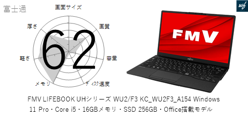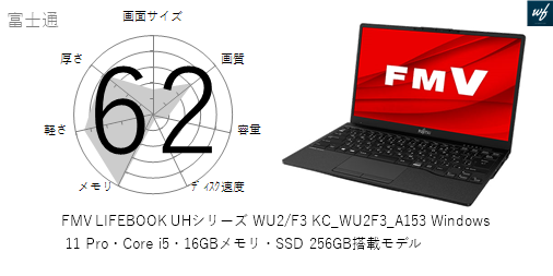 「FMV LIFEBOOK UHシリーズ WU2/F3 KC_WU2F3_A153 Windows 11 Pro・Core i5・16GBメモリ・SSD 256GB搭載モデル」はを採用しており、その性能は x となります。CPUスコアはです。