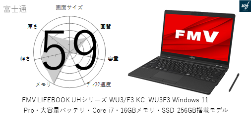 「FMV LIFEBOOK UHシリーズ WU3/F3 KC_WU3F3 Windows 11 Pro・大容量バッテリ・Core i7・16GBメモリ・SSD 512GB・Office搭載モデル」はを採用しており、その性能は x となります。CPUスコアはです。