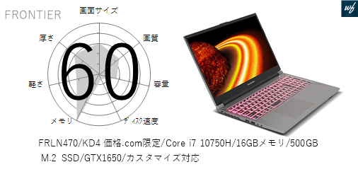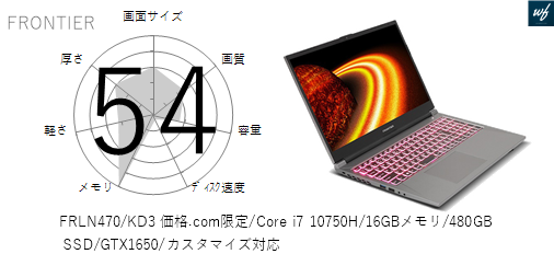 「FRLN470/KD4 価格.com限定/Core i7 10750H/16GBメモリ/500GB M.2 SSD/GTX1650/カスタマイズ対応」はを採用しており、その性能は x となります。CPUスコアはです。