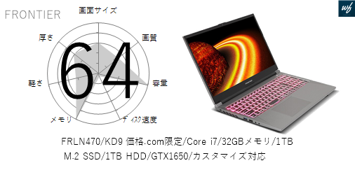 「FRLN470/KD9 価格.com限定/Core i7/32GBメモリ/1TB M.2 SSD/1TB HDD/GTX1650/カスタマイズ対応」はを採用しており、その性能は x となります。CPUスコアはです。