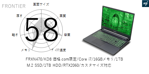 FRXN470/KD7 価格.com限定/Core i7/16GBメモリ/1TB M.2 SSD/RTX2060/カスタマイズ対応の 画面サイズ 画質 CPU性能 容量 メモリ 携帯性 重さ 厚み チャート