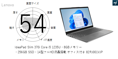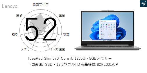 「IdeaPad Slim 370i Core i5 1235U・8GBメモリー・256GB SSD・17.3型フルHD液晶搭載 82RL001AJP」はを採用しており、その性能は x となります。CPUスコアはです。