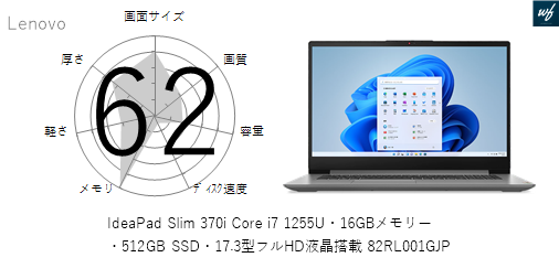 | 商品名 | IdeaPad Slim 370i Core i5 1235U・8GBメモリー・256GB SSD・17.3型フルHD液晶搭載 82RL001AJP | |||