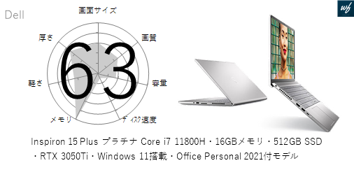 「Inspiron 15 Plus プラチナ Core i7 11800H・16GBメモリ・512GB SSD・RTX 3050Ti・Windows 11搭載・Office Home&Business 2021付モデル(ワイヤレスマウス付)」はを採用しており、その性能は x となります。CPUスコアはです。