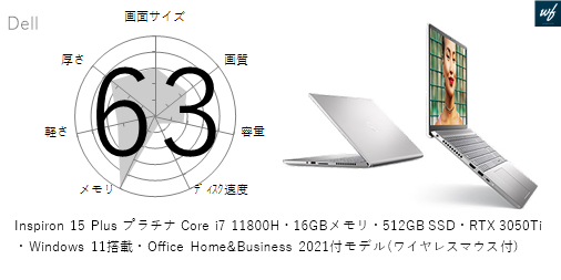 | 商品名 | Inspiron 15 Plus プラチナ Core i7 11800H・16GBメモリ・512GB SSD・RTX 3050Ti・Windows 11搭載・Office Home&Business 2021付モデル(ワイヤレスマウス付) | |||
