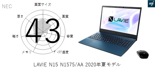 LAVIE N15 N1565/AA 2020年夏モデルの 画面サイズ 画質 CPU性能 容量 メモリ 携帯性 重さ 厚み チャート