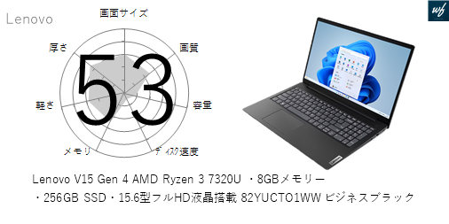 「Lenovo V15 Gen 4 AMD Ryzen 3 7320U ・8GBメモリー・256GB SSD・15.6型フルHD液晶搭載 82YUCTO1WW ビジネスブラック」はを採用しており、その性能は x となります。CPUスコアはです。