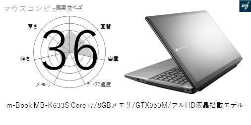 m-Book MB-K633S Core i7/8GBメモリ/GTX950M/フルHD液晶搭載モデルの 画面サイズ 画質 CPU性能 容量 メモリ 携帯性 重さ 厚み チャート