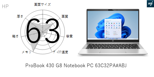ProBook 430 G8 Notebook PC 63C32PA#ABJの 画面サイズ 画質 CPU性能 容量 メモリ 携帯性 重さ 厚み チャート