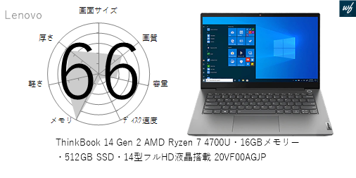 | 商品名 | ThinkBook 14 Gen 2 AMD Ryzen 7 4700U・16GBメモリー・512GB SSD・14型フルHD液晶搭載 オフィス付き 20VF00AEJP | |||