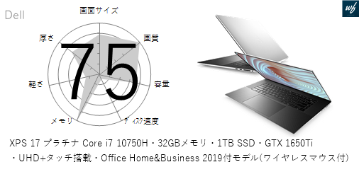 | 商品名 | XPS 17 プラチナ Core i7 10750H・32GBメモリ・1TB SSD・GTX 1650Ti・UHD+タッチ搭載・Office Home&Business 2019付モデル | |||